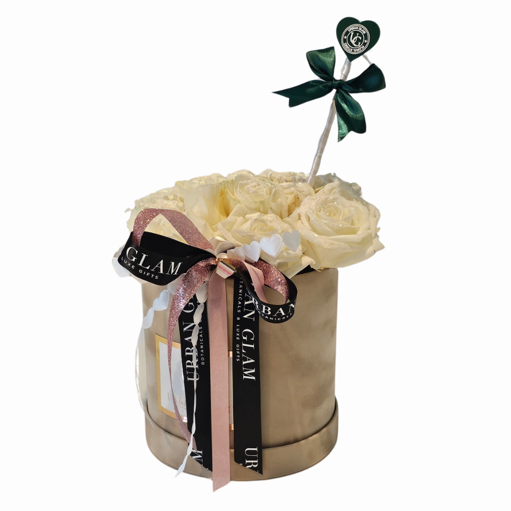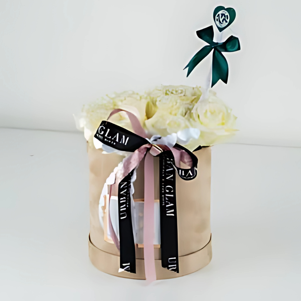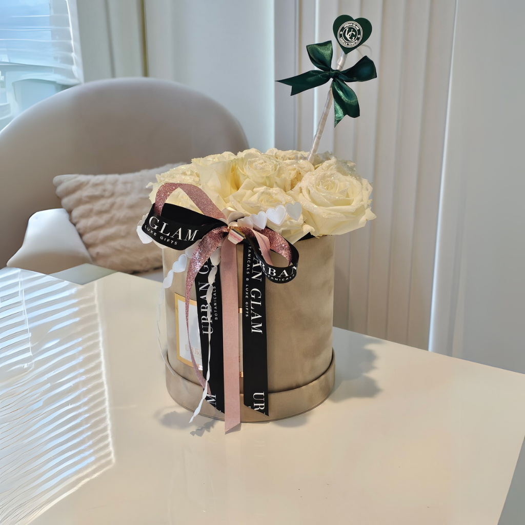 This bouquet is perfect for those who appreciate a blend of simplicity and sophistication, much like the iconic drink itself. It features velvety white flowers, each carefully arranged to resemble fluffy whipped cream. The bouquet is beautifully presented in a velvet khaki-colored floral box with green accents.
