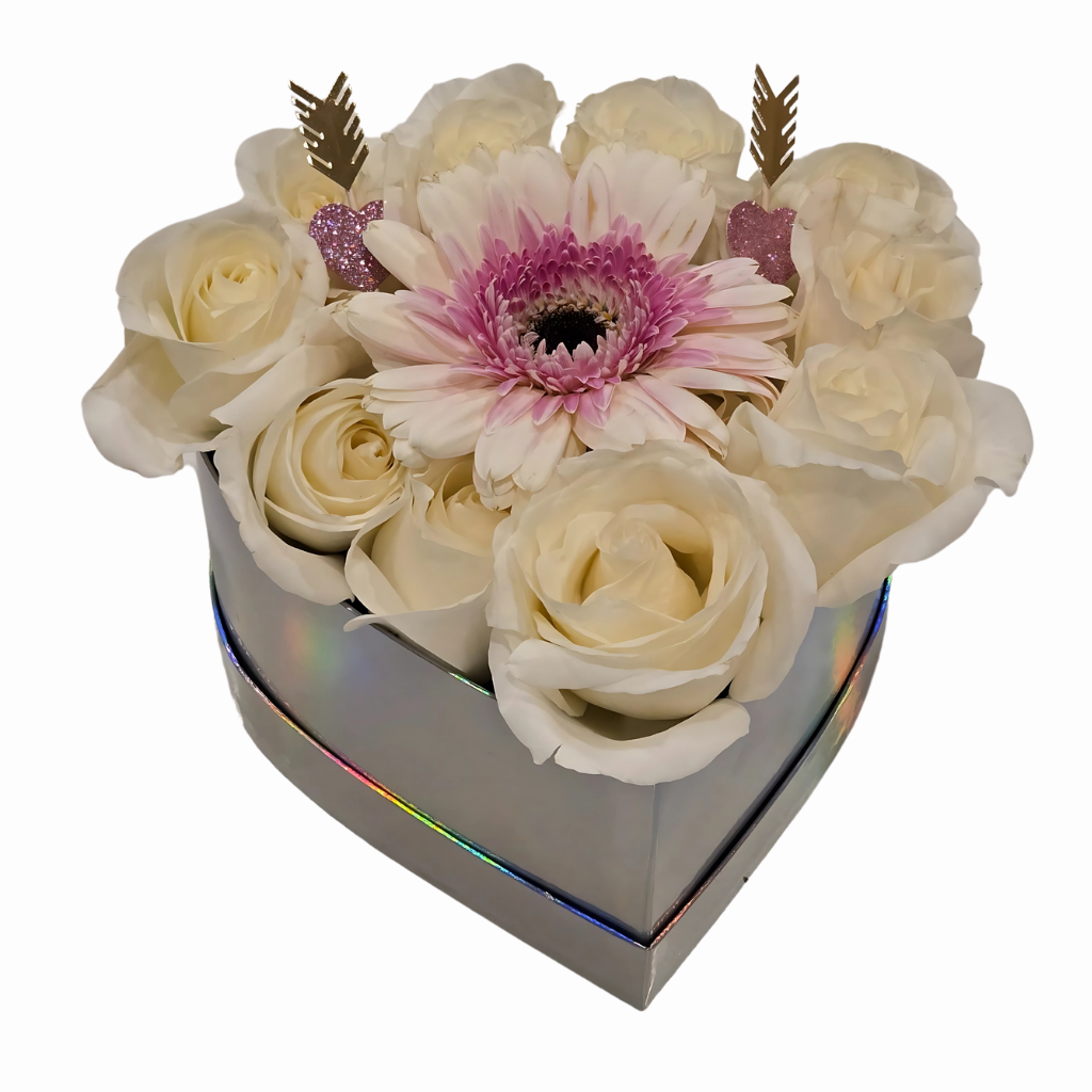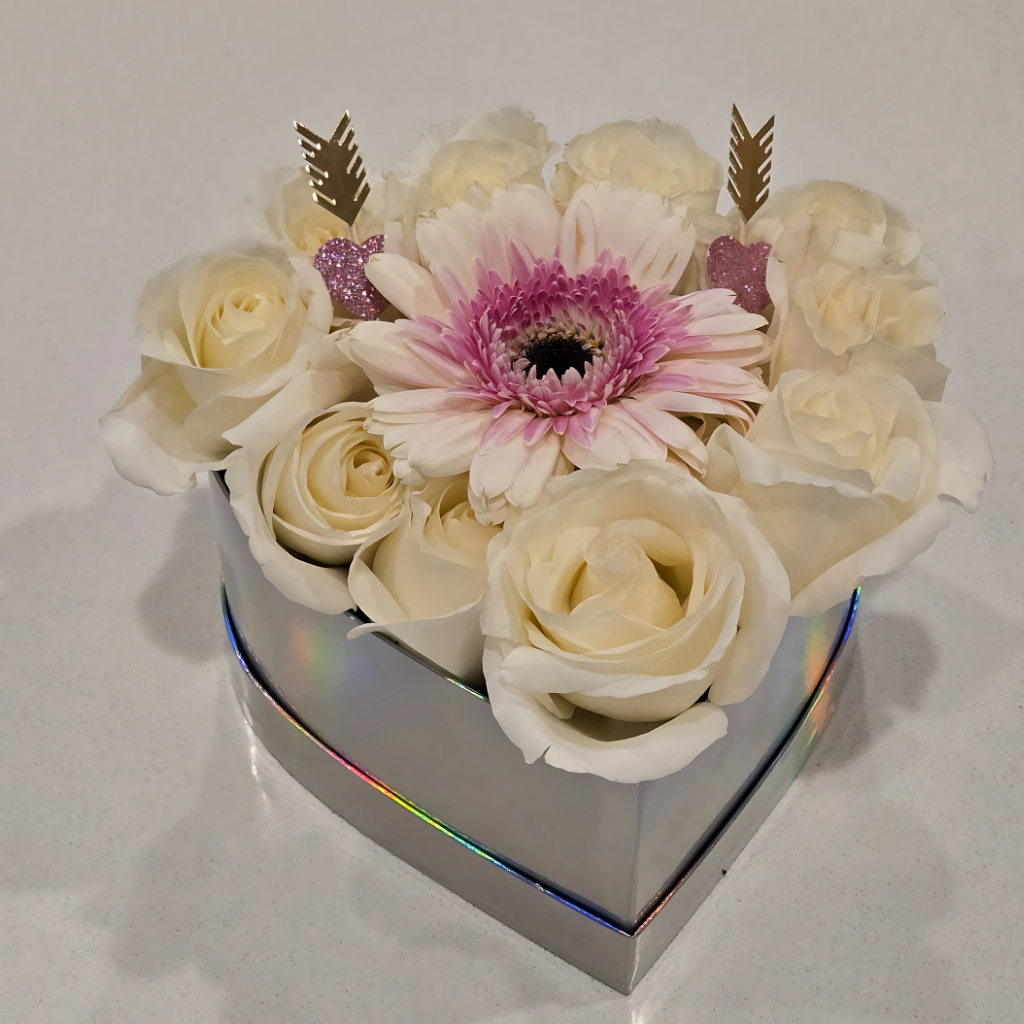 Holographic heart shaped box with assorted flowers in pinks, purples, and whites
